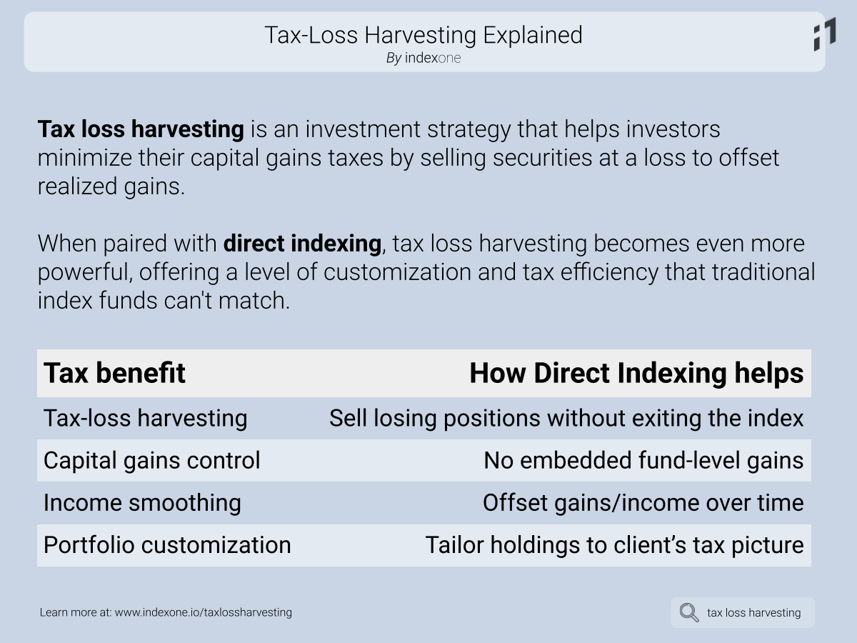 If a client owns the S&P 500 via direct indexing and one stock drops significantly, that stock can be sold at a loss while the rest of the index remains intact. The proceeds can be reinvested in a similar security to maintain market exposure (while adhering to wash-sale rules).